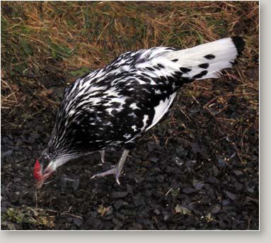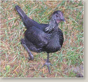 Fleur Booted Bantam hens, a Black Cochin hen, two Wyandotte large
